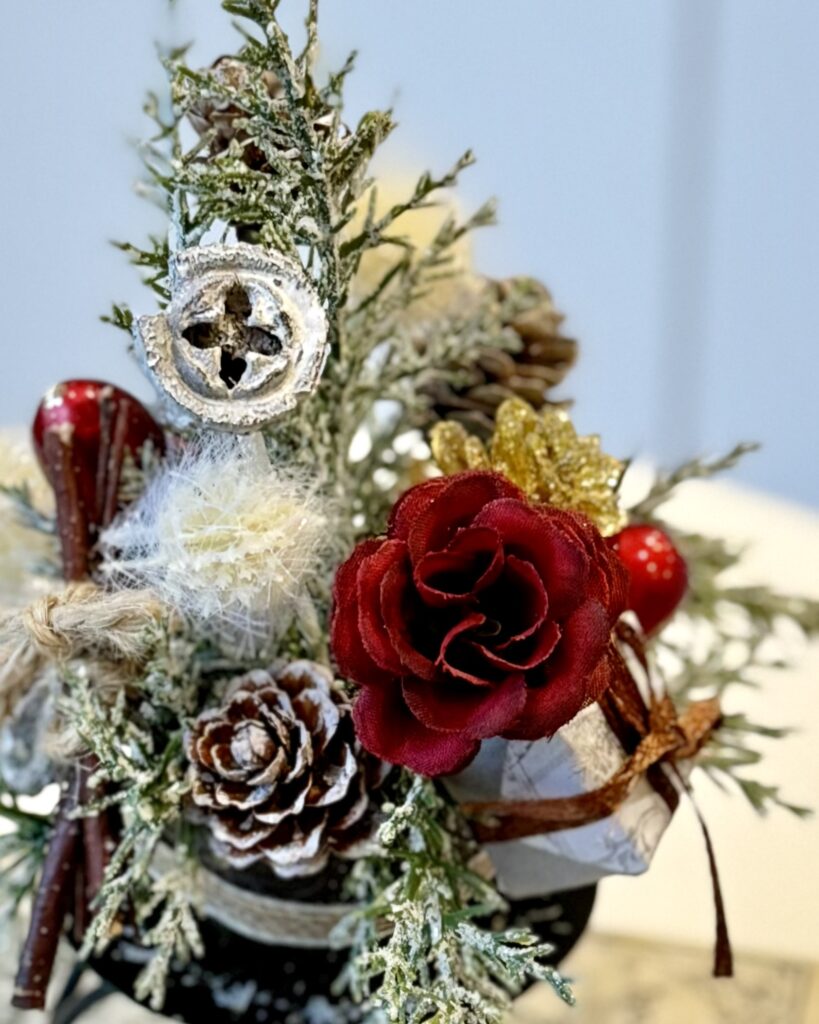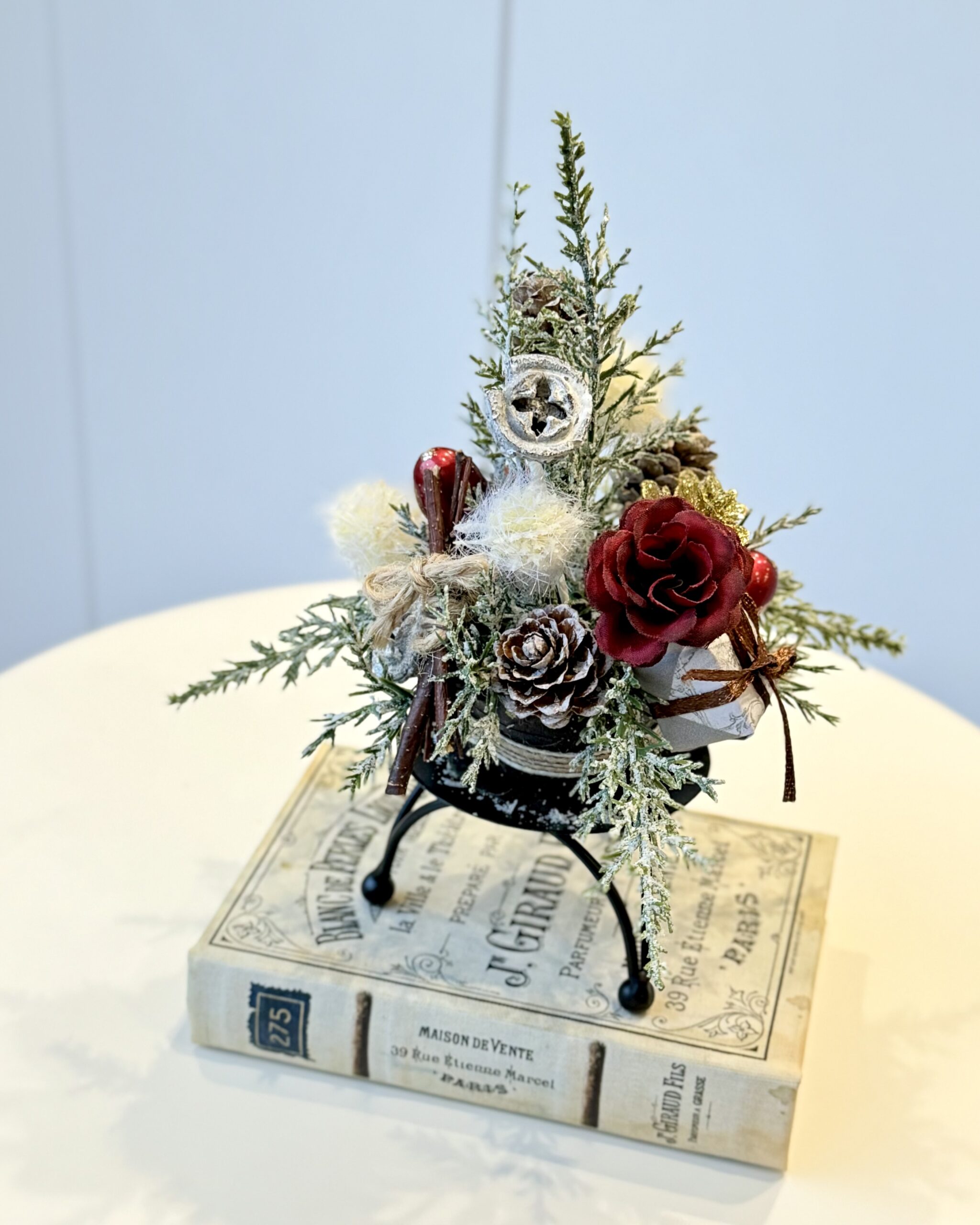 ころっとしたフォルムに、木の実や深い赤のローズ、